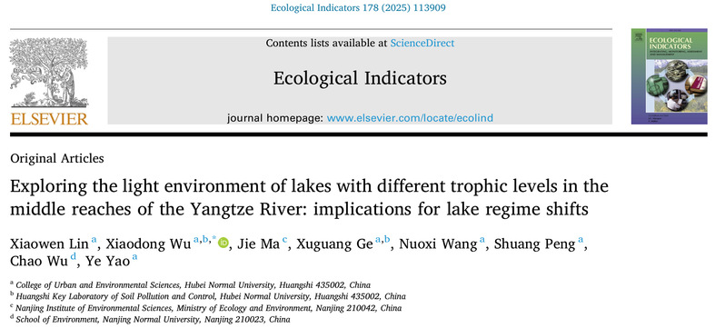 论文信息:Xiaowen Lin, Xiaodong Wu*, Jie Ma, Xuguang Ge, Nuoxi Wang, Shuang Peng, Chao Wu, Ye Yao. Exploring the light environment of lakes with different trophic levels in the middle reaches of the Yangtze River: Implications for Lake Regime Shifts [J]. Ecological Indicators. 2025, 178:113909.