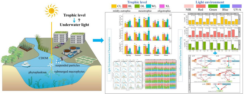 水下光环境影响营养盐循环与生源要素耦合,进而决定湖泊生态系统的初级生产力。然而,不同营养水平对水下光环境的影响仍不清楚。该研究团队于2022年通过全年的野外调查,首次对长江中游不同营养水平典型湖泊的紫外-A(UV-A)、蓝、绿、红和近红外光进行定量化探索。研究表明,UV-A 光在不同营养水平湖泊中始终表现出最快的衰减,蓝光、绿光、红光和近红外光在轻度富营养化湖泊中衰减最快,而在贫营养湖中衰减最慢。红蓝光比(R/B)年均值遵循轻度富营养湖>中营养湖>贫营养湖的模式。不同的光衰减率进一步导致了水下光环境的显著变化。轻度富营养化和中营养湖泊的水下光谱范围较宽,在空气和水面上以近红外光为主,而红光和绿光在水下0.5 m处占主导地位。然而,贫营养湖泊的光谱范围较窄,峰值明显。0.5 m以下水面以绿光和蓝光为主,而UV-A光比例保持在4%以上。该研究表明,浊度在不同营养水平湖泊中发挥着更普遍的主导作用,这可能是由于它在人为影响下对固体悬浮物和有机污染的综合反应。未来需要加强对这两种污染物的监测,以保障沉水植物的恢复和生长,维持湖泊的清水稳态。