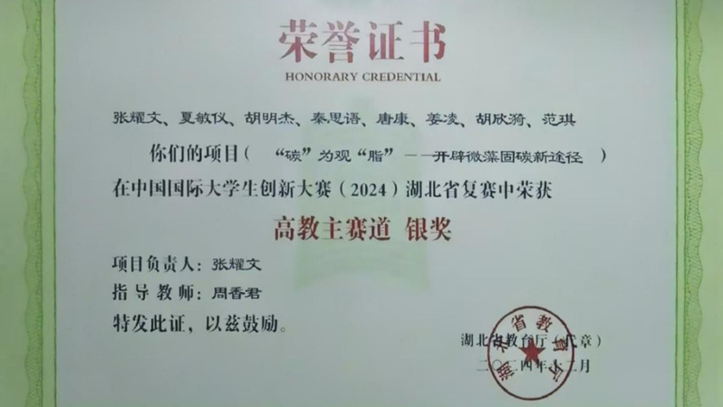 她秉持“以赛代学”的理念,自大一便积极投身各类学科竞赛,以提升综合能力与科研素养。在中国国际大学生创新大赛(2024)中,她通过高强度的团队协作显著提升了沟通与合作能力,最终获得了湖北省省级银奖。为奠定科研基础,她主持了一项大学生创新创业训练计划项目,并获评国家级优秀项目;期间,她主动与导师及研究生团队保持密切交流,有效推进了项目研究。在本科期间,她积极投身于学术研究,以第一作者在省级期刊上发表学术论文一篇,以参与者在《中国农学通报》期刊上发表学术论文一篇。