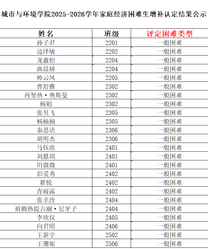 根据《关于做好2025-2026学年家庭经济困难学生认定工作的通知》文件精神, 做爱视频 2025-2026学年贫困生认定工作已经结束,后经学生申请,班级民主评议,学院审核通过增补入库一批家庭经济困难学生,现将认定结果进行公示。