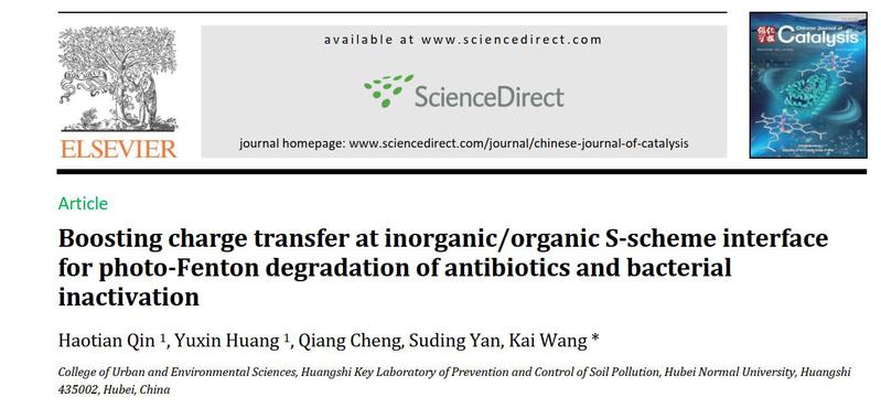 5月,Chinese Journal of Catalysis(《催化学报》)在线发表该团队研究成果,论文题为“Boosting charge transfer at inorganic/organic S-scheme interface for photo-Fenton degradation of antibiotics and bacterial inactivation”(《无机/有机异质结中S型电荷分离增强光芬顿降解抗生素及抑菌性能》)。团队2022级硕士研究生秦浩天与2024级硕士研究生黄雨欣为论文共同第一作者,王楷教授为论文唯一通讯作者。Chinese Journal of Catalysis是Elsevier出版社旗下的化学领域期刊,SCI中科院大类一区TOP期刊,最新影响因子为17.7。