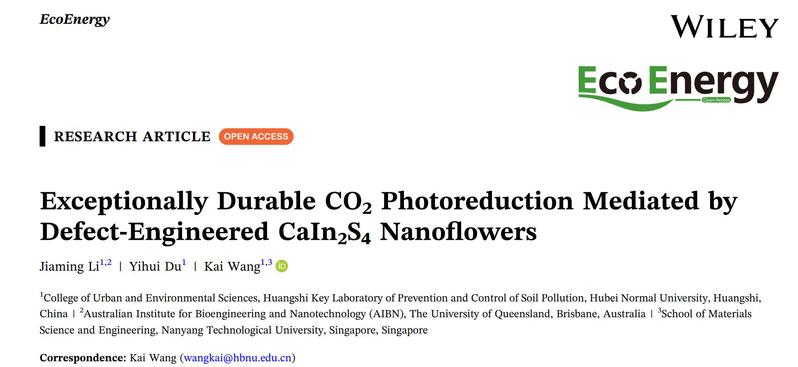 11月,EcoEnergy(《生态能源》)在线发表该团队研究成果,论文题为“Exceptionally Durable CO2 Photoreduction Mediated by Defect-Engineered CaIn2S4 Nanoflowers”(《缺陷工程调控CaIn₂S₄纳米花实现超长寿命CO₂光还原》)。团队青年教师李嘉明博士为第一作者,王楷教授为论文唯一通讯作者。EcoEnergy是Wiley出版社旗下的能源领域期刊,即时影响因子为19.1。