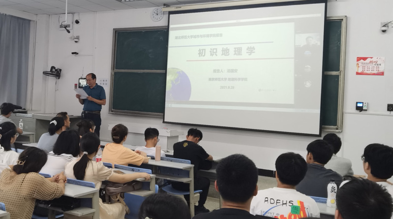 为进一步强化2021级新生专业认知、培养专业认同感,9月28日,全国模范教师、国家级教学名师、南京师范大学汤国安教授应邀通过腾讯会议形式为城环学院新生作了题为《初识地理学》的学术报告。城环学院党委书记杨应华、副院长葛绪广、地理科学系主任吴晓东及教师代表、2021级地理科学全体新生共200余人在现场聆听了报告。院长王湖坤、院党委副书记陈卓及地理专业教师、研究生等在线收听了报告,报告会现场由葛绪广主持。