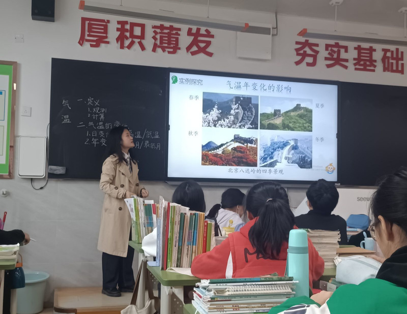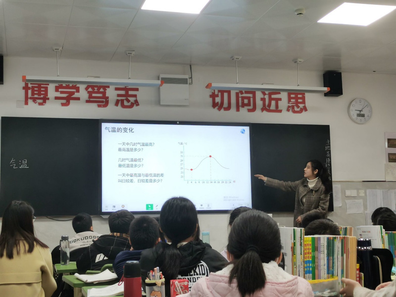 第二堂课谭老师以同学们日常生活中所观看的天气预报进行导入,贴近生活,提高同学们的学习兴趣。在教学中,谭老师设置了丰富的探究活动,并侧重结合现实景观和生活实例,加深学生对地理现象的理解。同时,在绘制气温年变化曲线图的环节,为同学们编制了口诀,有利于同学们更好地掌握绘图技巧。