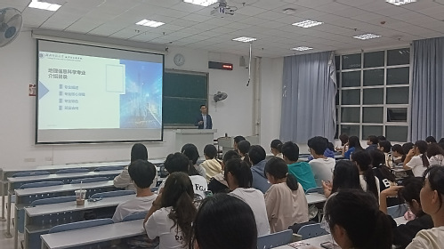 首先,陈爽老师向参加本次讲座的同学介绍荆现文老师,并要求同学们认真聆听本次讲座,为后期的专业学习打好基础。随后,荆现文老师从“专业概述”、“专业核心课程”、“专业特色”、“就业去向”等四个方面进行介绍。他通过介绍地理信息科学的学科性质、时代背景、产业前景、专业核心教程,让同学们对地理信息科学专业有了进一步地了解。同时荆老师告诉同学们理论与实践紧密相结合是地理信息专业的特色,除了测量学、地理信息系统等理论知识的学习,还要进行地理信息的处理与分析、地图可视化制作等实践训练,有一半的课程内容要通过实践研究来掌握。最后,荆老师结合学院往届学生就业去向,向参加此次讲座的同学介绍地理信息科学专业的就业前景和就业方向,并在现场互动环节耐心倾听同学们的问题,并为他们答疑解惑。
