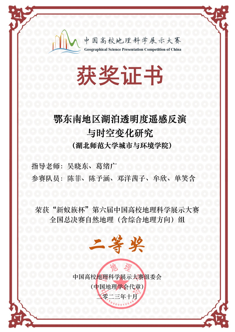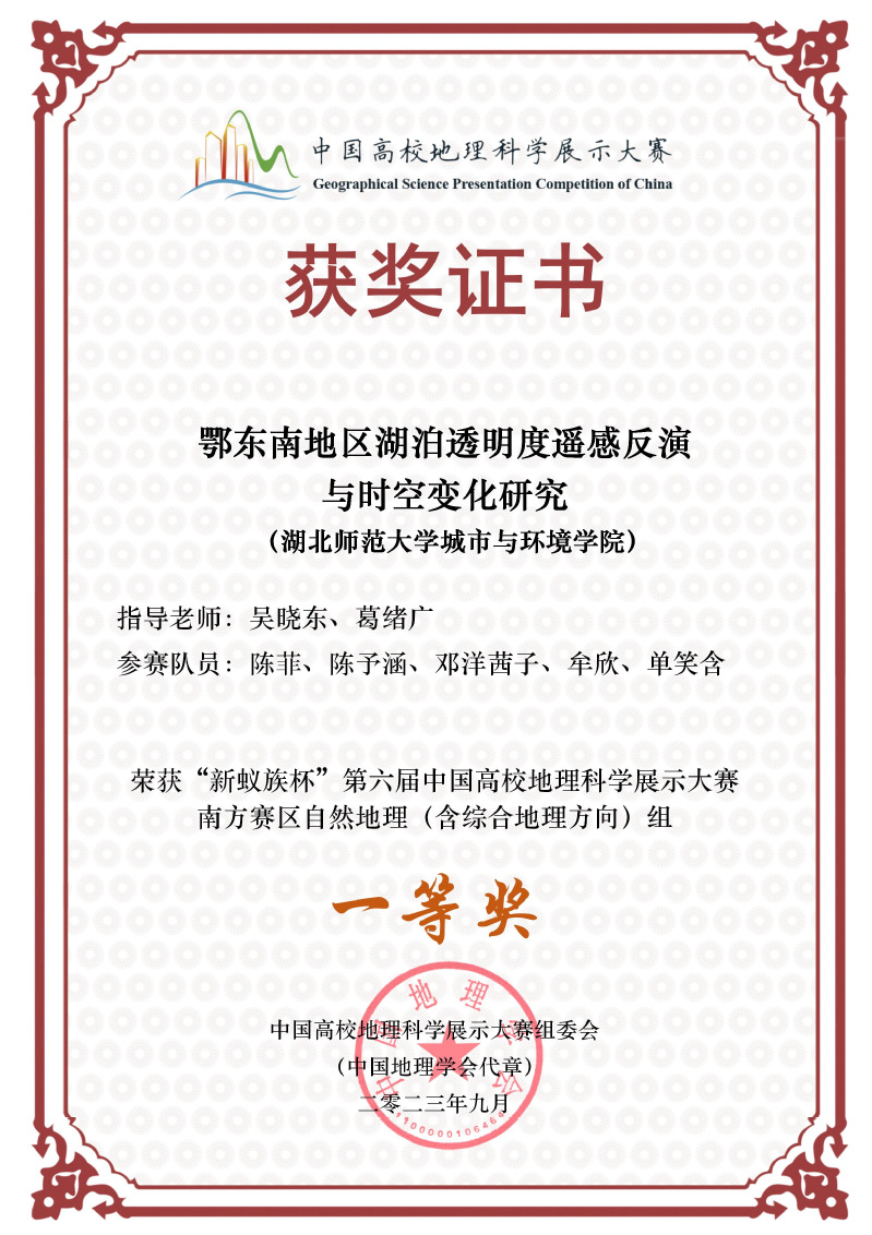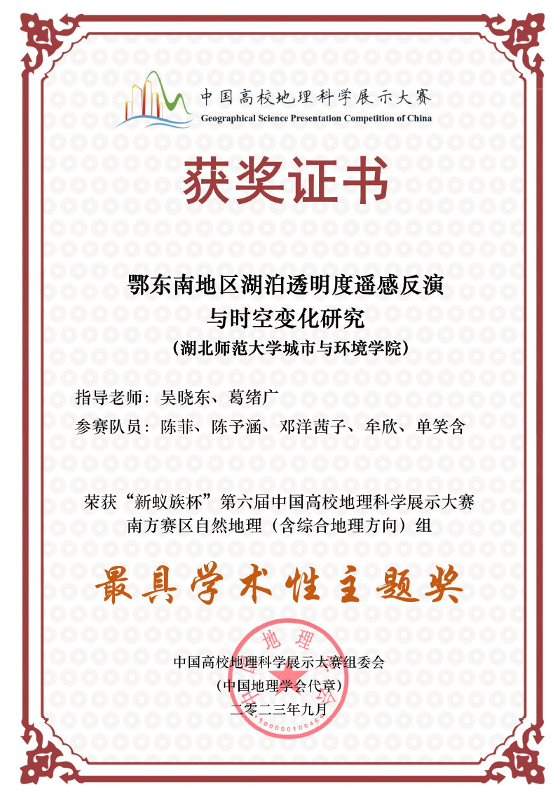 2023年9-10月,“新蚁族杯”第六届中国高校地理科学展示大赛南方赛区决赛、全国总决赛分别在南宁师范大学和西北大学举行。近日,比赛结果公布,做爱视频 地理科学专业本科生展示的作品《鄂东南地区湖泊透明度遥感反演与时空变化研究》(指导教师:吴晓东、葛绪广)以总分第一的优异成绩获南方赛区自然地理组一等奖、最具学术性主题奖和最具创新性主题奖,并获全国总决赛二等奖。