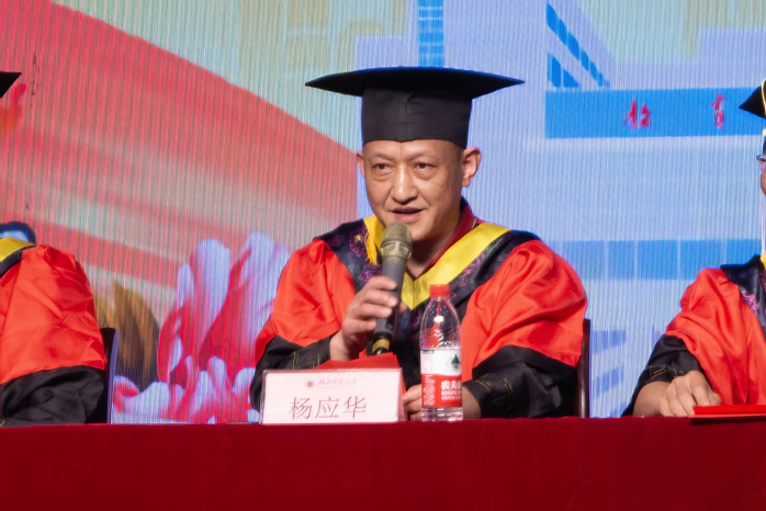 10点整,毕业典礼在庄严雄壮的国歌声中拉开了序幕。学院党委书记杨应华致辞,他代表学院向299名本科生和19名硕士研究生圆满完成学业表示热烈祝贺,对毕业生们提出了几点希望:一是以主动精神追寻人生的航标,成为一个因为主动而内心安宁的人;二是以人文情怀去从容求索,希望同学们身上奔涌着前辈学者的精神血脉,虽不可见,却实际拥有着绵延不息的伟力。最后,他深情地嘱托同学们在努力拼搏,同时绑定电子校友卡,常回家看看。