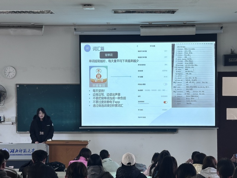 首先由张潇予学姐来分享宝贵的考试经验。学姐以自己拿手的题块开始讲起,详细地把题块的答题技巧分享给同学们。她着重强调了背单词的关键性,还热情地推荐了几款好用的学习软件,她的分享让同学们受益良多。